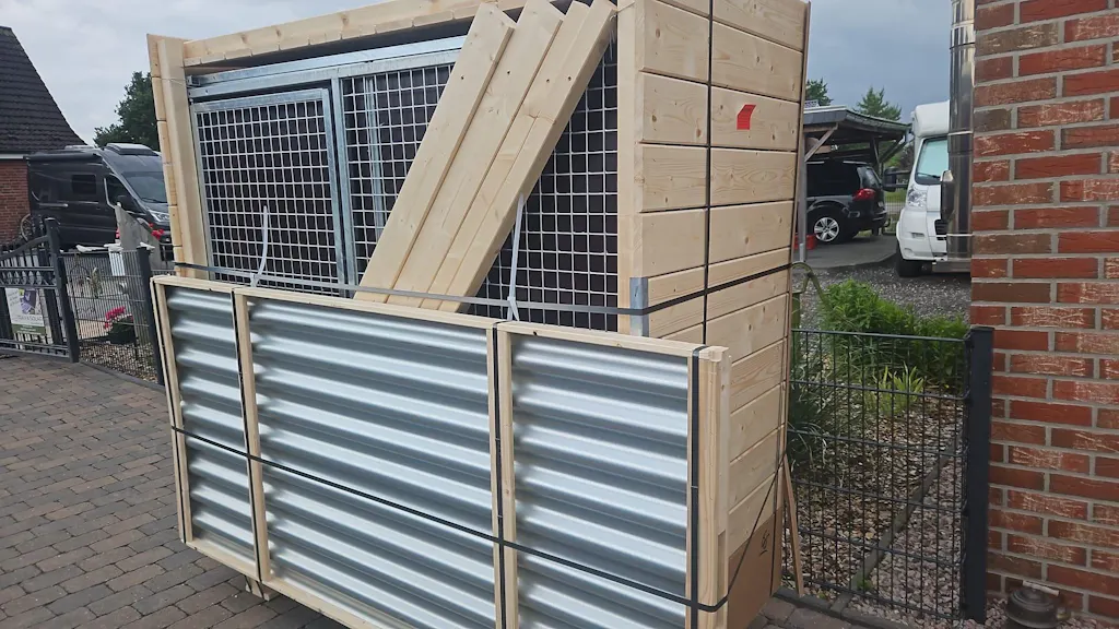 Wetterfestigkeit und Langlebigkeit: Nach dem Aufbau des Hundezwingers muss dieser mit einer Holzlasur behandelt werden, um ihn wetterfest zu machen. Alle unbehandelten Holzteile (Dachhölzer und Seitenbretter) müssen beidseitig gestrichen werden. Der Holzboden muss nicht gestrichen werden. Die Lasur ist nicht im Lieferumfang enthalten.