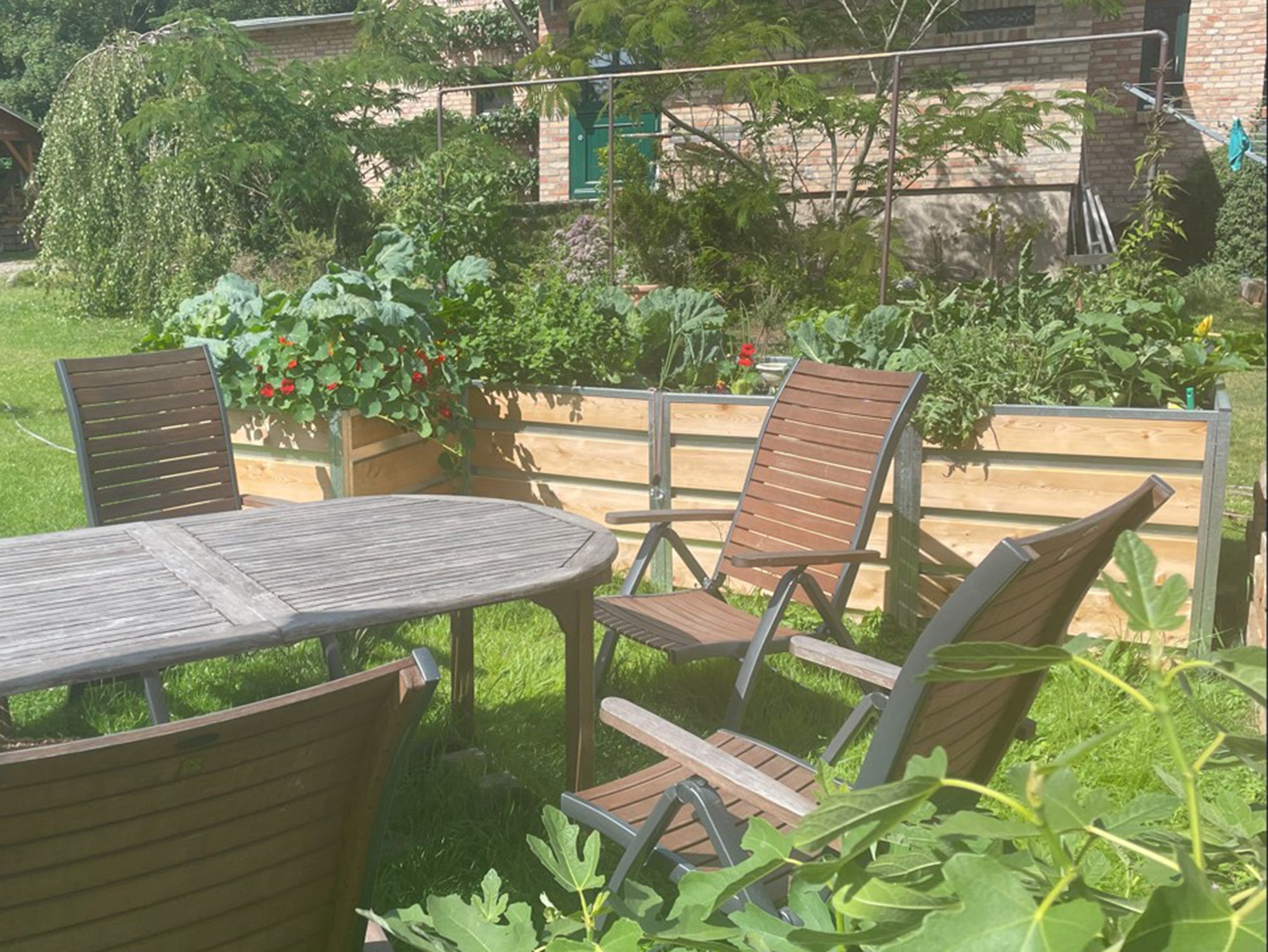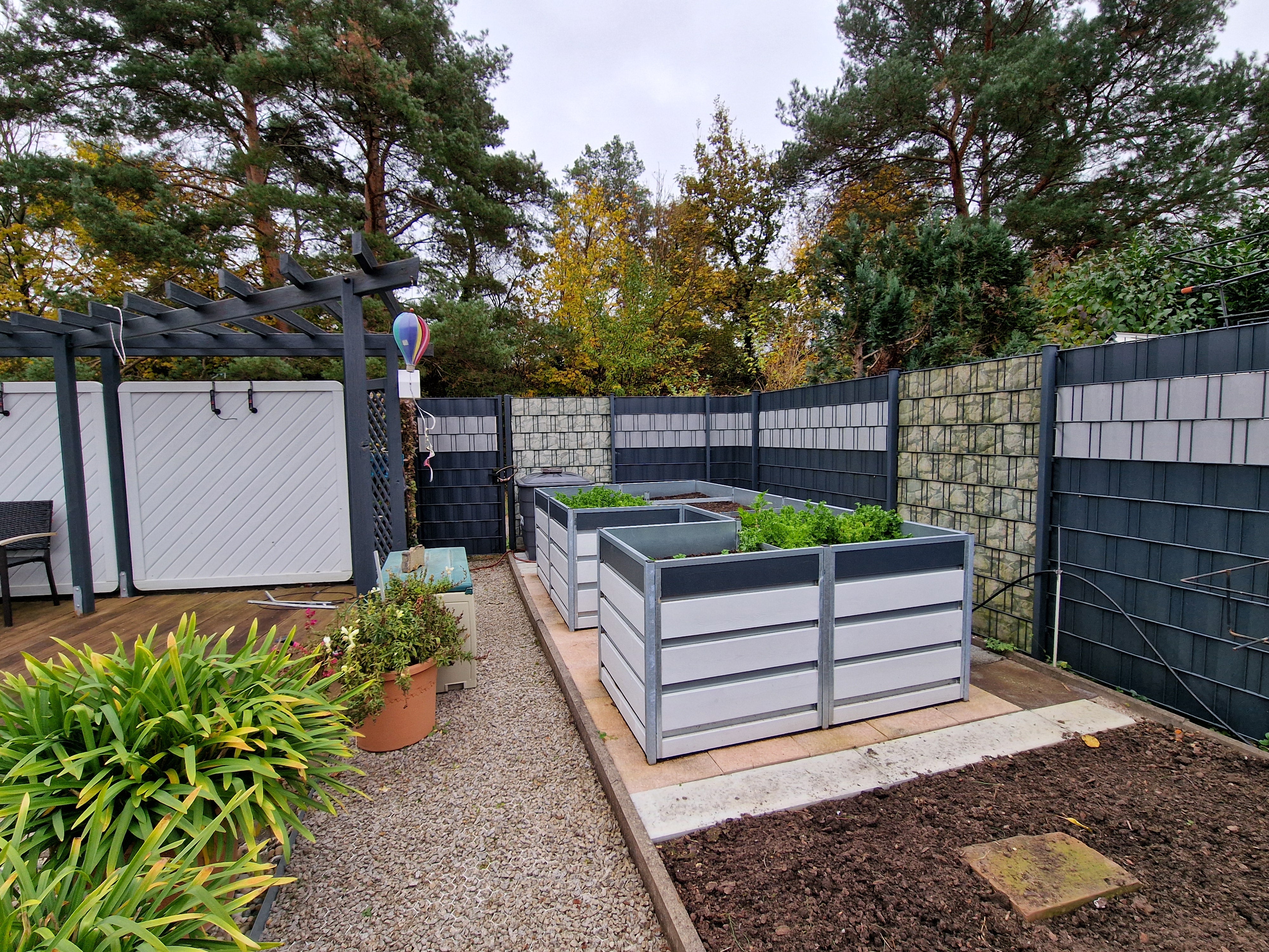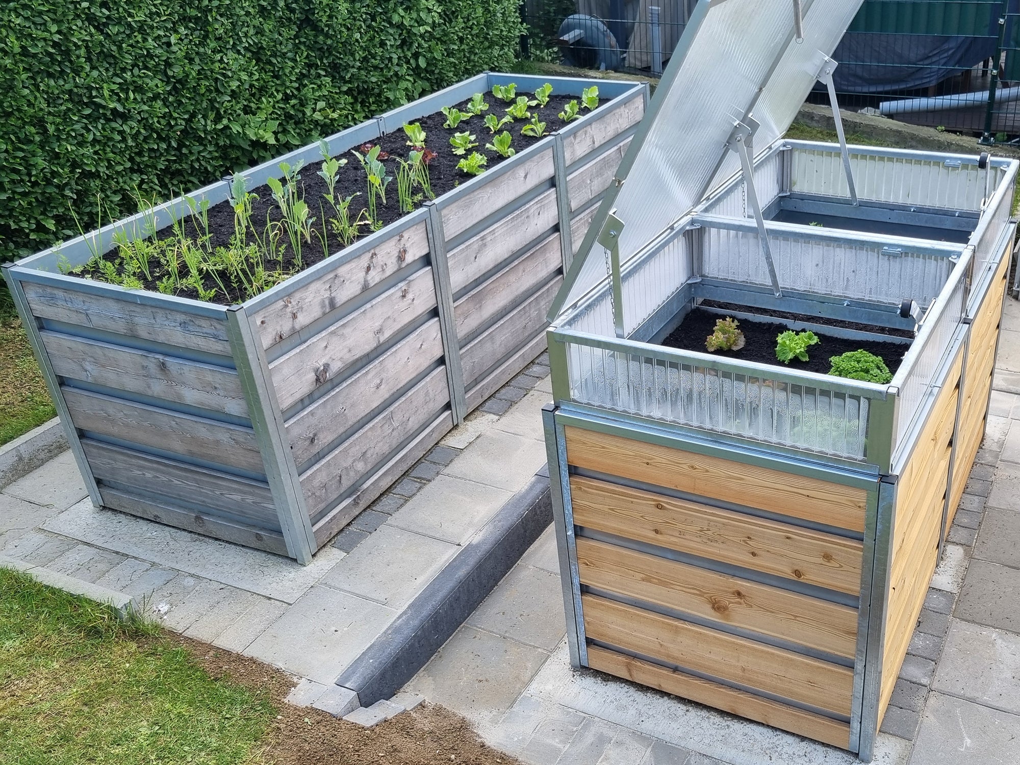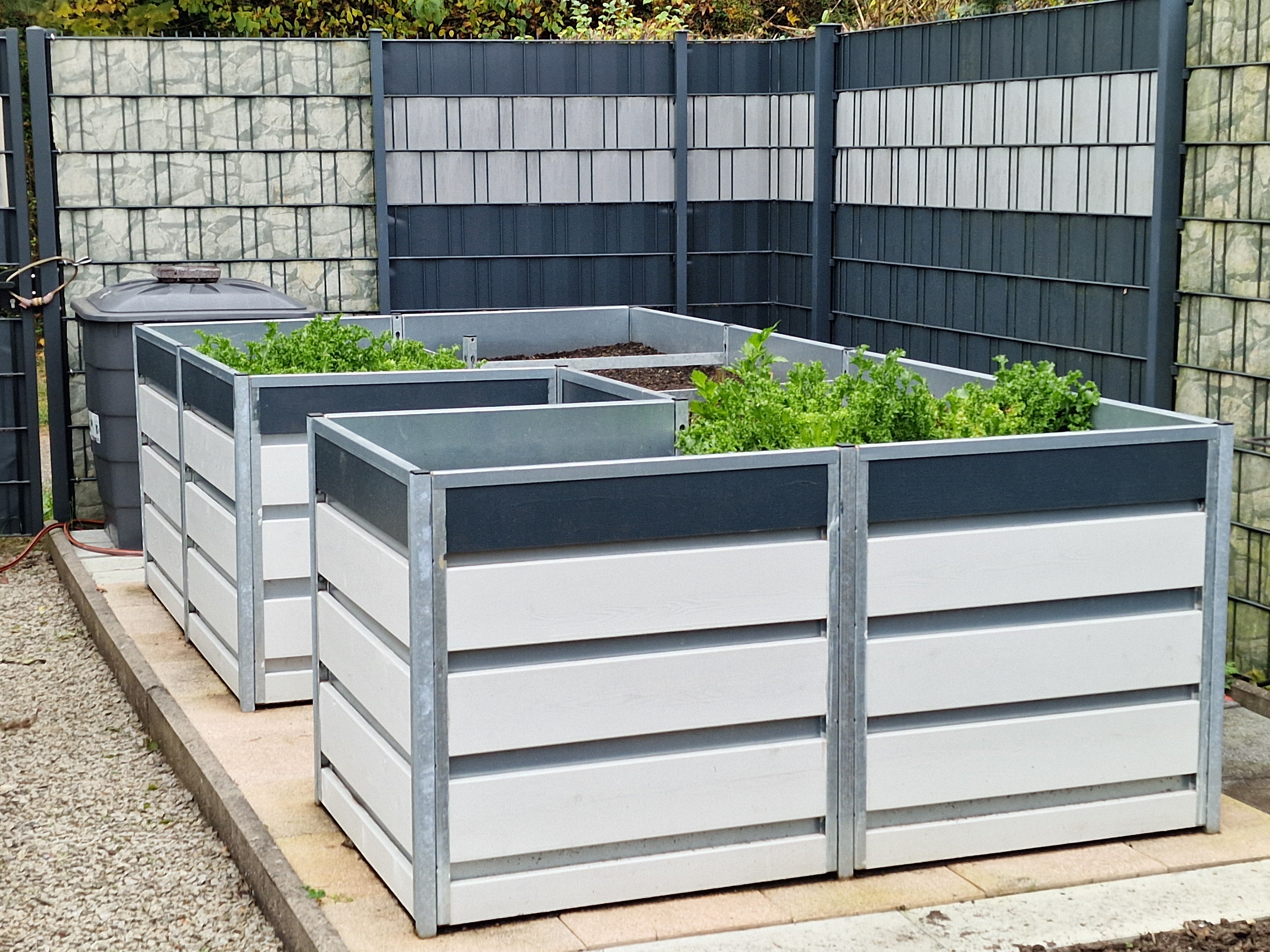 Unsere Hochbeete bestehen aus Einzelelementen, die jeweils in ein senkrechtes Vierkantrohr eingehängt werden. Die Innenseite des Hochbeets sind mit feuerverzinktem Blech ausgekleidet. Dadurch wird Staunässe an den Brettern vermieden.